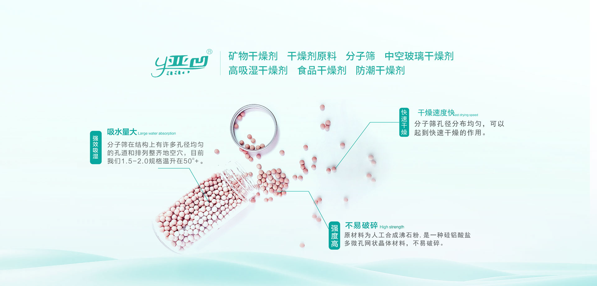 2010年,公司確立剝離非核心業(yè)務,專門從事中空玻璃分子篩的研發(fā)、生產和銷售,公司現主營產品包括中空玻璃干燥劑,百葉中空玻璃干燥劑,食用油脫色劑,汽車剎車干燥劑等,產品廣泛應用于玻璃制品、汽車零部件、鞋帽、服裝、箱包、食品等行業(yè),具有無毒、無味、無腐蝕性、性能穩(wěn)定、綠色環(huán)保、吸附性強等特點。